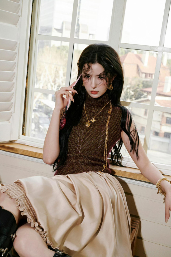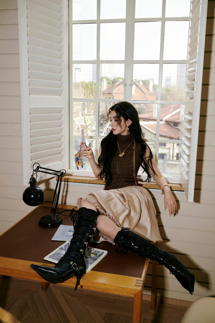 窗畔光影流转间,化身守旧港风好意思东说念主,演绎旧时光的韵味与东方好意思感。高领真挚衫刻画出唯妙弧线,缎面半裙垂坠感完全,裙摆的木耳边贪图更添祥和氛围感。