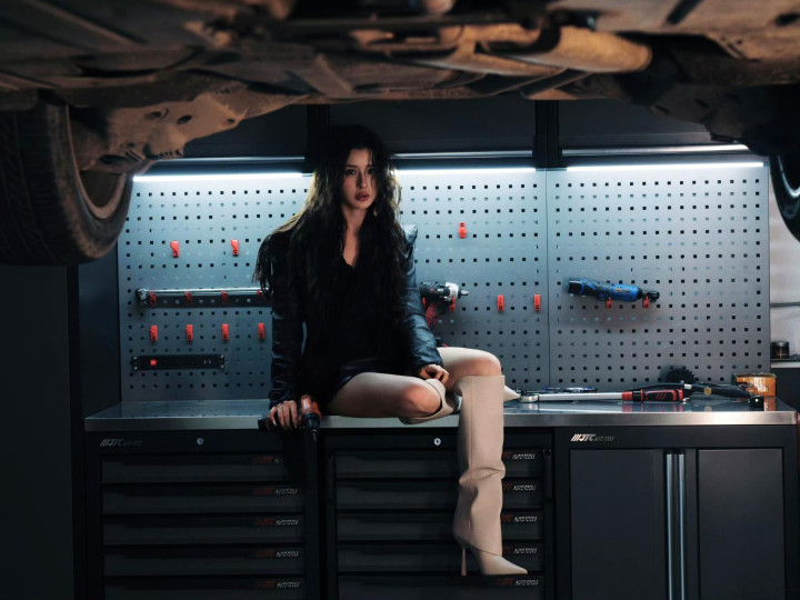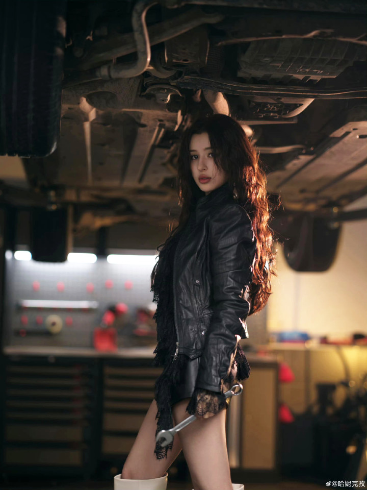 手抓扳手立于车底,长腿纤细吸睛,眼力带着故事感,工业风场景与甜酷穿搭碰撞出极致张力,将野性与精细、力量与柔好意思完好交融。