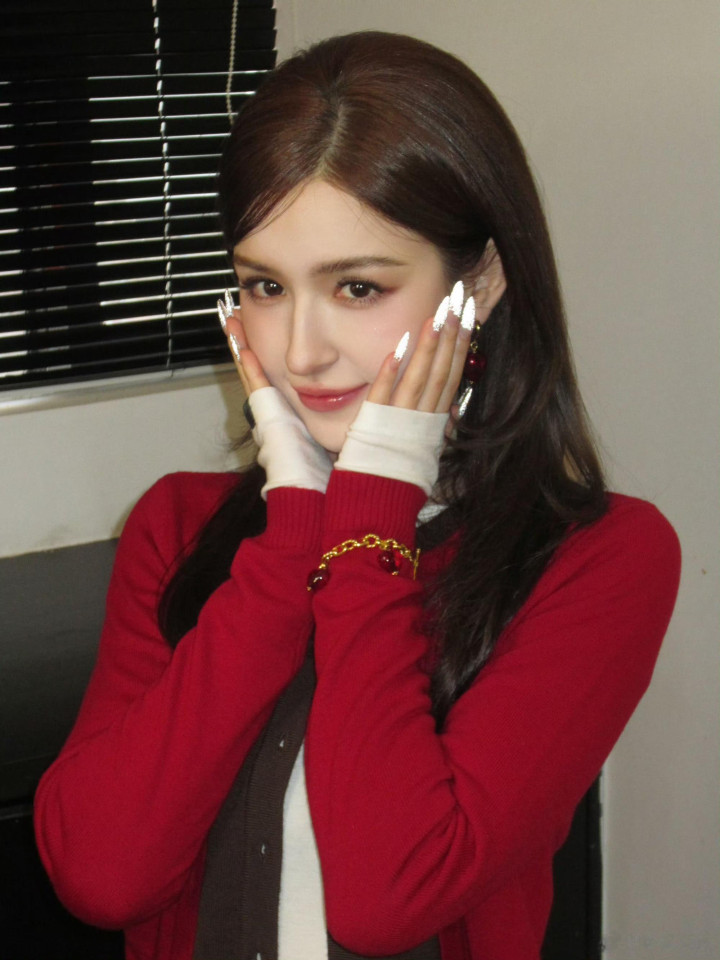 切换成祥和甜妹模样,仙女的水灵与明媚言外之音。红棕撞色开衫检朴又亮眼,搭配白色内搭与深色半裙,经典配色突显出温婉气质,红色樱桃耳环为全体造型添了一抹巧想。