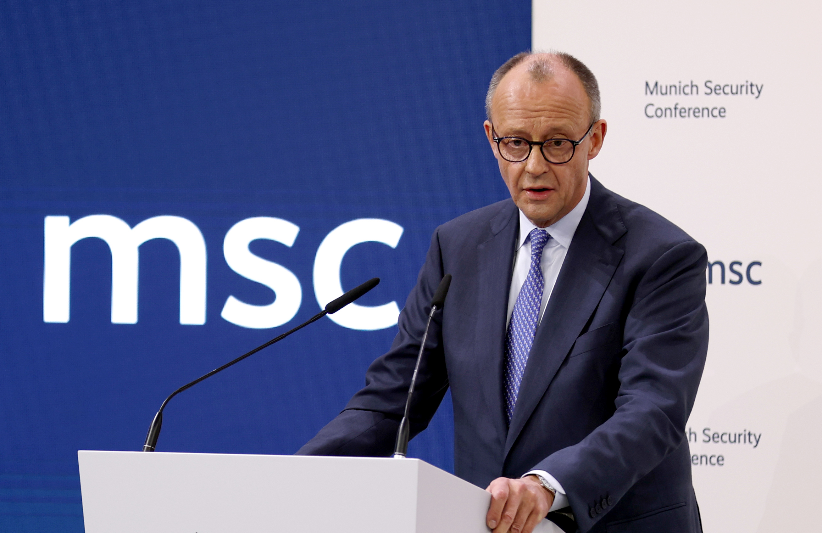 ▲当地时期2月13日,德国总理默茨在第62届慕尼黑安全会议开幕式上致辞。图/新华社