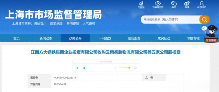 2026年4月24日,上海市市集监督措置局公示《江西方大钢铁集团企业投资有限公司收购云南德胜物流有限公司等五家公司股权案》。具体情况如下: