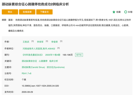 2.王胜武,李保军,李俊荣.颈动脉窦详尽征心跳骤停抢救收效2例临床分析[J].内科急危重症杂志,2005,11(4):195-196.DOI:10.3969/j.issn.1007-1024.2005.04.020.