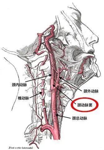 颈部两侧肌肉粉饰下的颈总动脉,在上行经过中会分叉为颈内动脉和颈外动脉,分辨为颅内和颅外供血。颈内动脉的肇始处有一扩张部分,被称为“颈动脉窦”,内部存在着压力感受器,不错感知血压升高时对血管壁的刺激,进而将信号传入大脑,促使内脏血管扩张、心率降速,并使血压缩小。