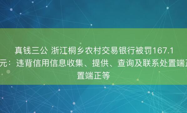 真钱三公 浙江桐乡农村交易银行被罚167.15万元:违背信用信息收集、提供、查询及联系处置端正等