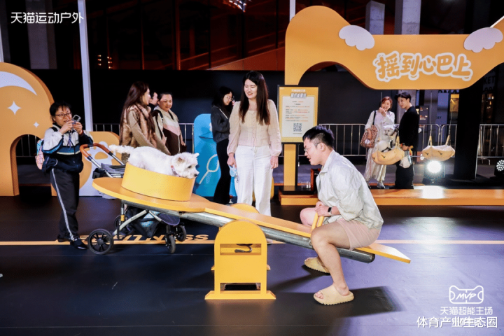 铺张者们被不同作风的体育场景不绝眩惑:前一秒还在跑步机上感受热汗体能的强度,下一秒又走到历练区翻起轮胎,再往前几步,宠物健身区里的东谈主和小狗一齐玩跷跷板……「热汗街区」在这么的氛围中具象化。