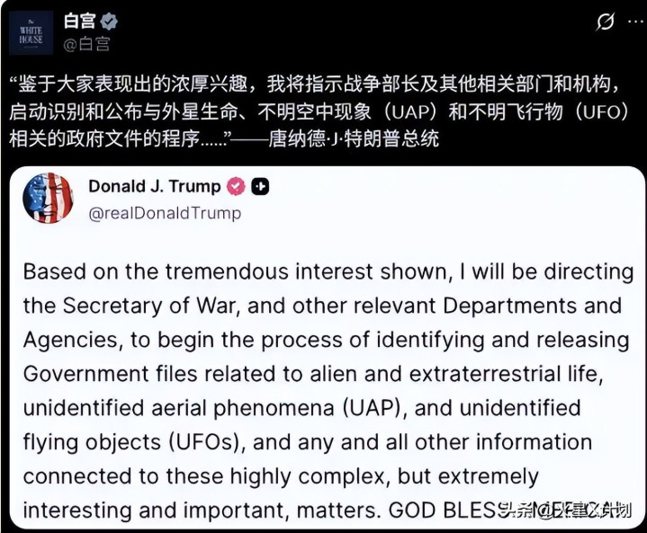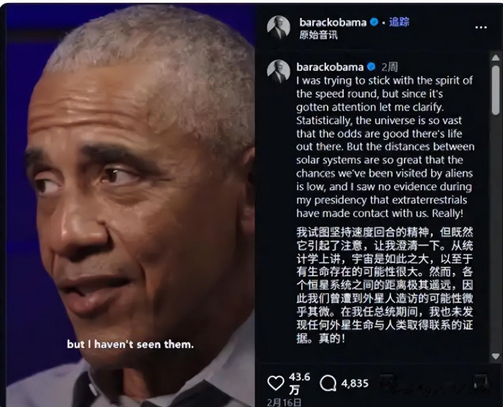 此番动作的背后,是此前奥巴马在一次汇集访谈中说起“外星东说念主确乎存在”所激发的四百四病,特朗普就地责怪其前任表现了高度神秘信息。