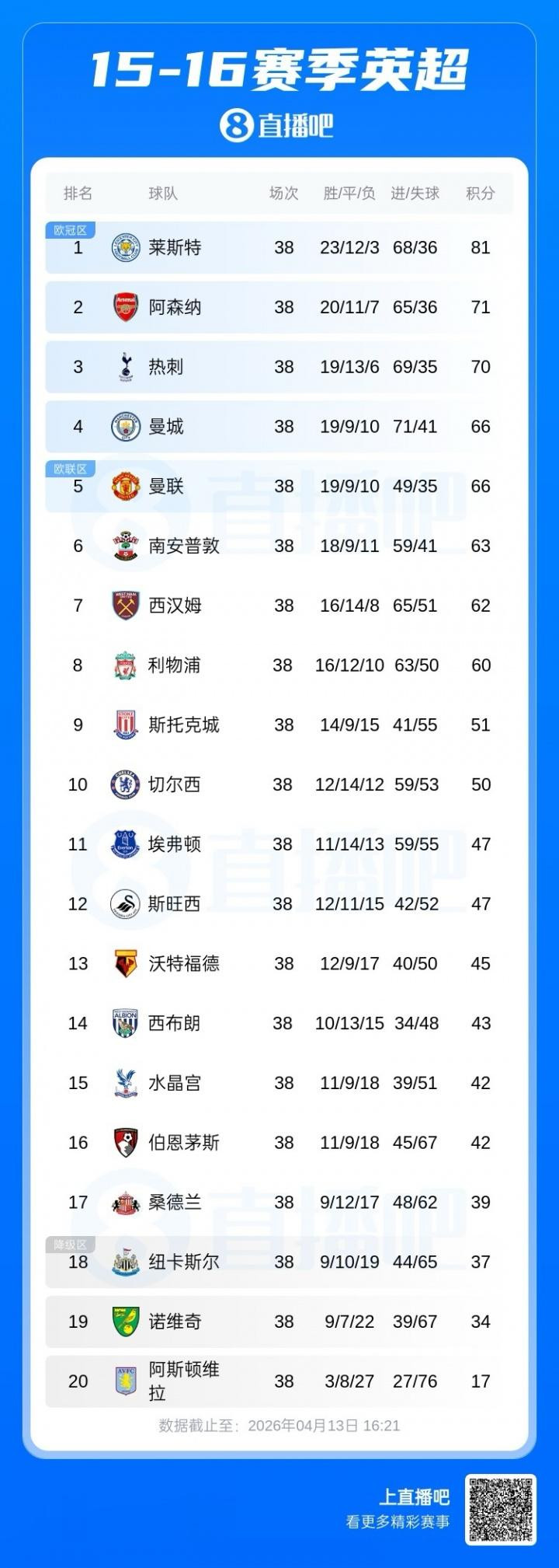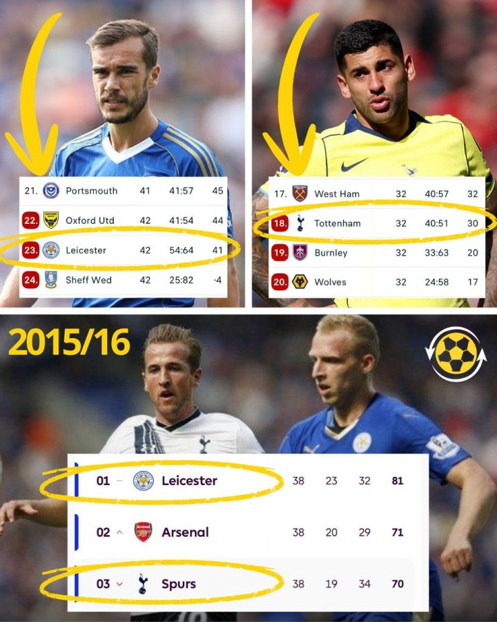 2015/16赛季英超,莱斯特城81分古迹夺冠,而热刺以11分之差最终名范例三。