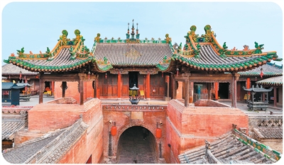 空王行祠位于张壁古堡北部,其殿顶上的琉璃构件均施以黄、绿、孔雀蓝釉,其中,孔雀蓝光泽最为纯正,仿佛采湖水之色,凝碧空之韵。脊瓴上雕有游龙翔凤、雷公和牡丹枝蔓,顶部直立的琉璃武士横目嗔视。大殿廊下,东西各立有一块琉璃碑,碑帽为二龙戏珠图案,碑身通体施以孔雀蓝釉,号称琉璃珍品。