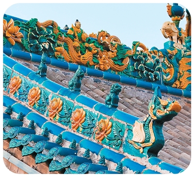 张壁古堡空王行祠殿顶上的琉璃构件。